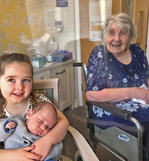 At Belmont Care and Nursing Home in Stocksbridge, 84-year-old resident Gwen Coopland received a visit from her newest great-child, Chester and five-year-old great-granddaughter Phoebe.